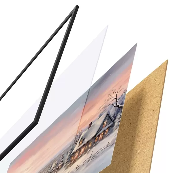 Le poster se compose d'un cadre, d'un plexiglas, d'une image imprimée et d'un support en aggloméré. Le poster peut être immédiatement accroché au mur grâce aux fixations au dos.