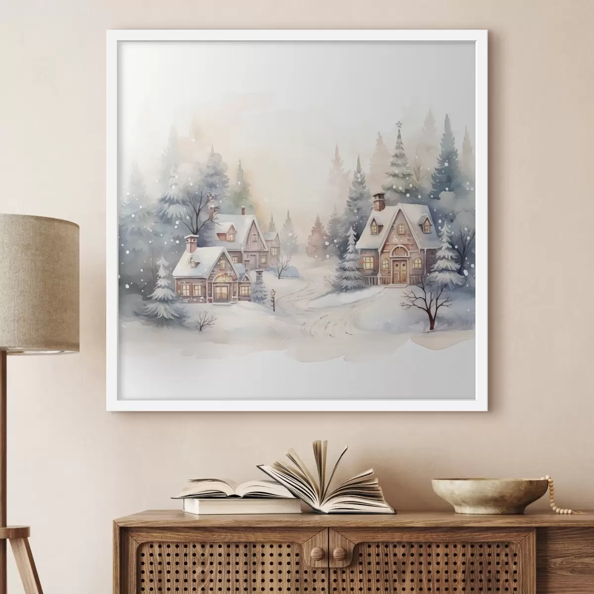 Affiche Paysage d'hiver, forêt de pins, belles maisons, aquarelle, susnet Non f41390