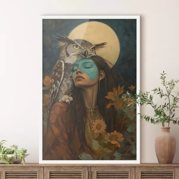 Affiche Femme avec hibou, style tribal, pleine lune, fleurs f41444