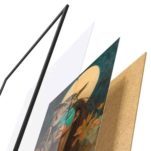Le poster se compose d'un cadre, d'un plexiglas, d'une image imprimée et d'un support en aggloméré. Le poster peut être immédiatement accroché au mur grâce aux fixations au dos.