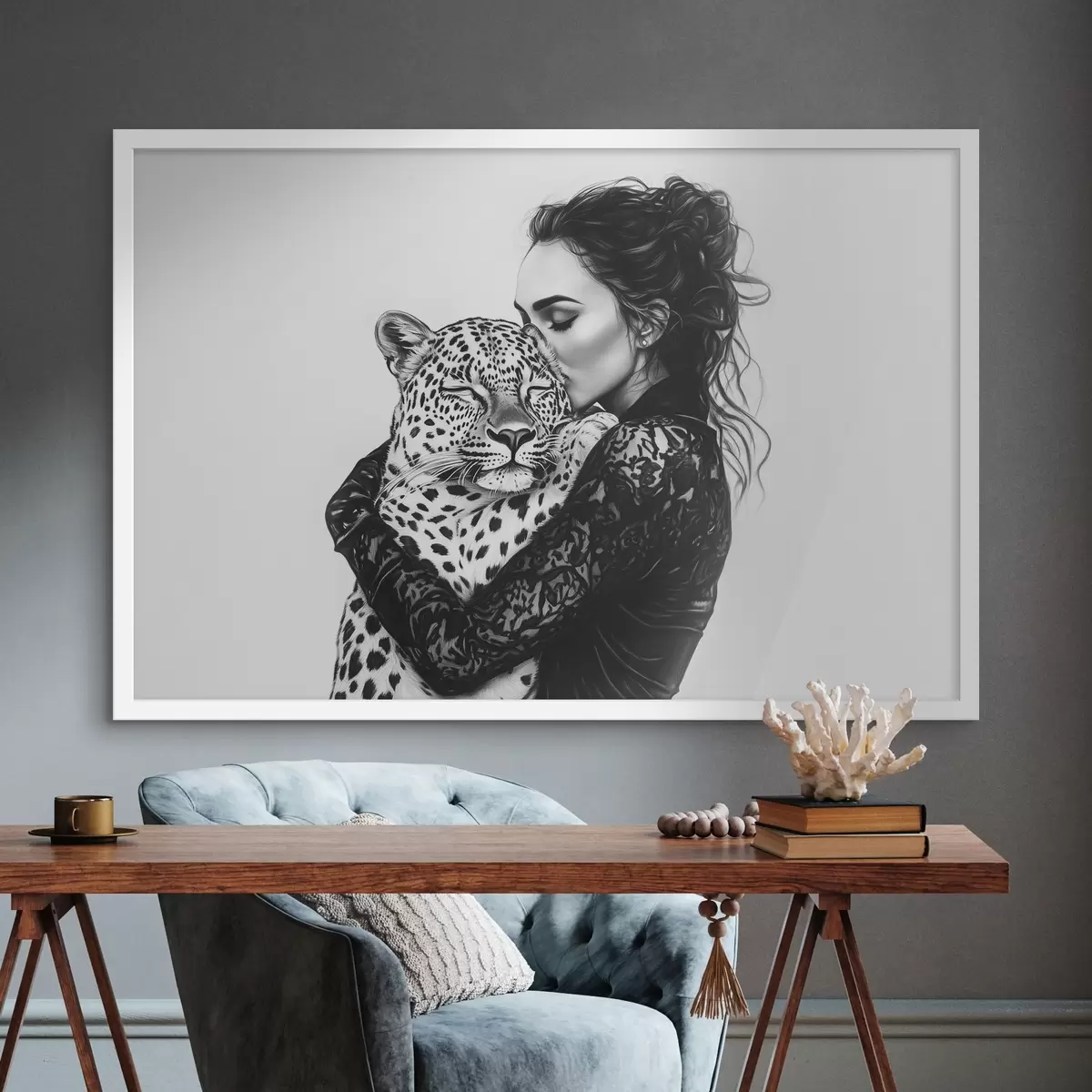 Affiche Femme embrassant un léopard, dessin au crayon, animaux sauvages, noir et blanc f41457