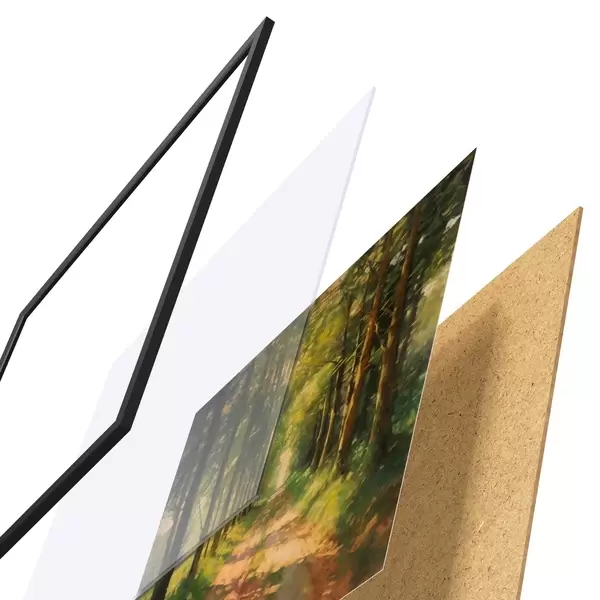 Le poster se compose d'un cadre, d'un plexiglas, d'une image imprimée et d'un support en aggloméré. Le poster peut être immédiatement accroché au mur grâce aux fixations au dos.