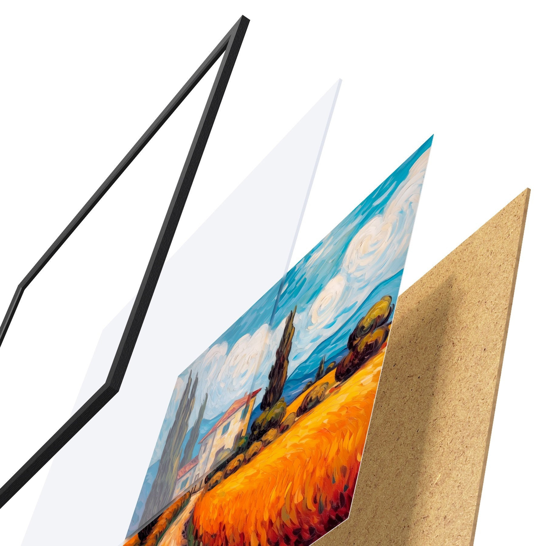 Le poster se compose d'un cadre, d'un plexiglas, d'une image imprimée et d'un support en aggloméré. Le poster peut être immédiatement accroché au mur grâce aux fixations au dos.