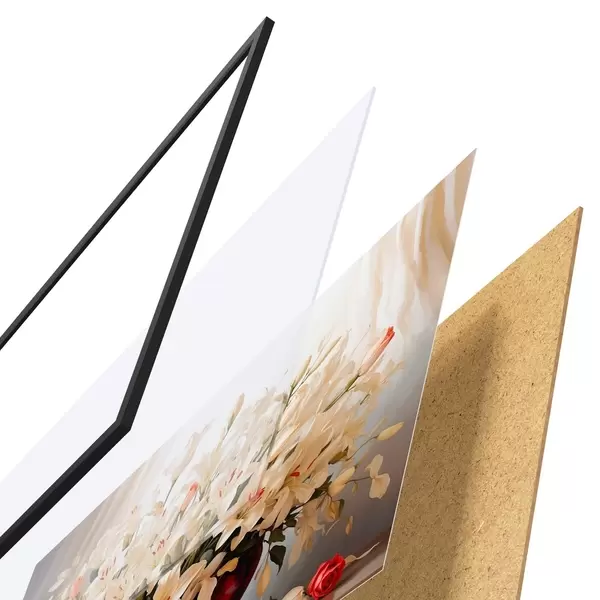Le poster se compose d'un cadre, d'un plexiglas, d'une image imprimée et d'un support en aggloméré. Le poster peut être immédiatement accroché au mur grâce aux fixations au dos.