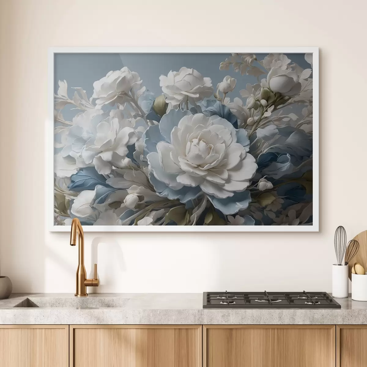 Affiche Fleurs et feuilles blanches sur fond bleu Non f41527