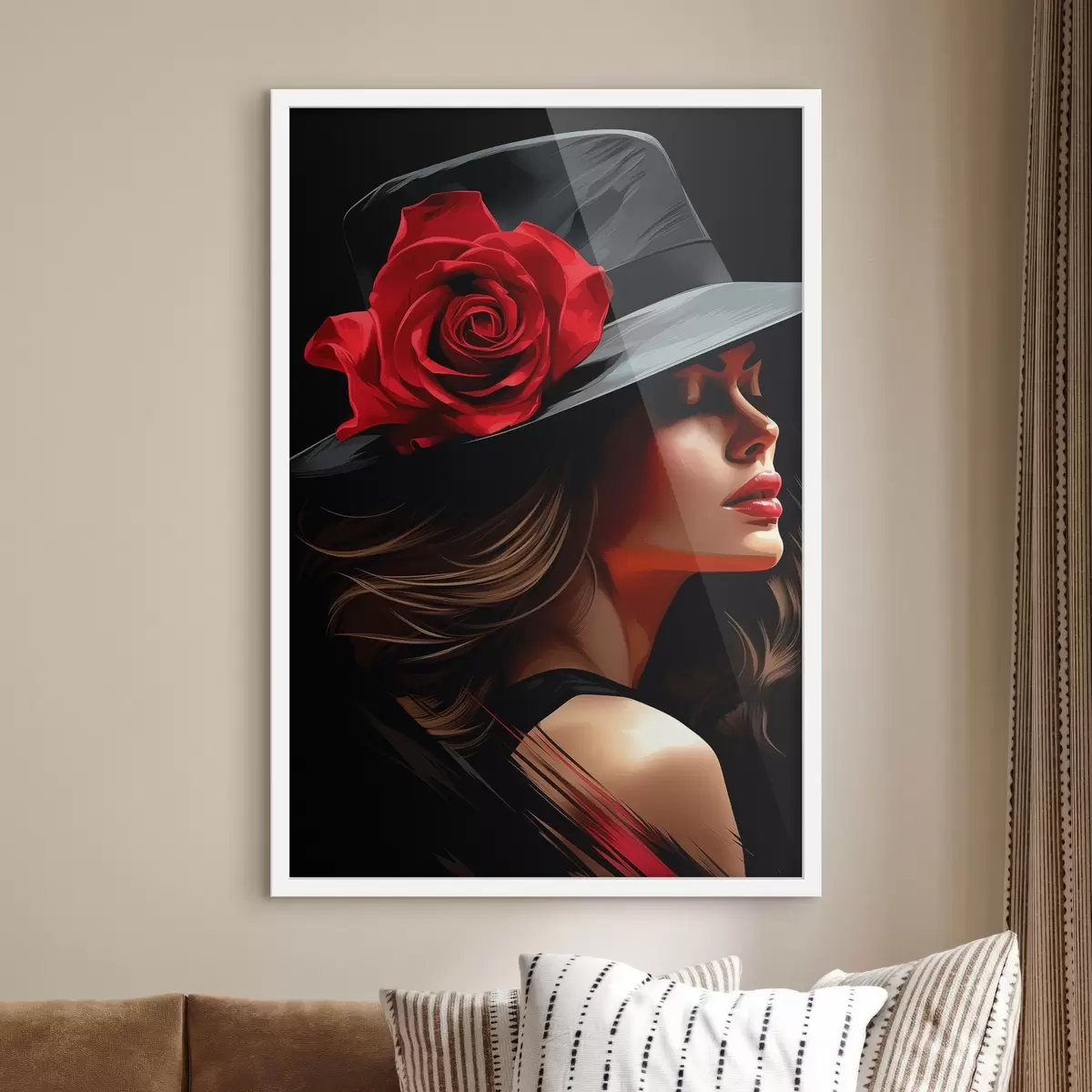 Affiche Illustration fille au chapeau avec une belle rose chic Non f41546