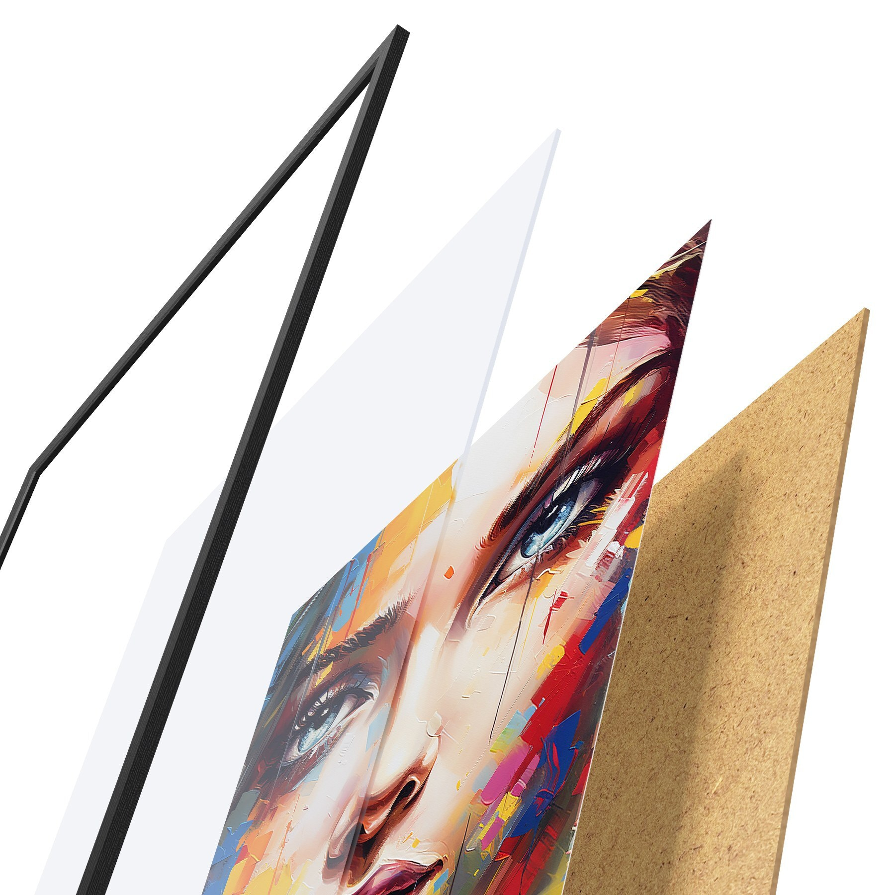 Le poster se compose d'un cadre, d'un plexiglas, d'une image imprimée et d'un support en aggloméré. Le poster peut être immédiatement accroché au mur grâce aux fixations au dos.