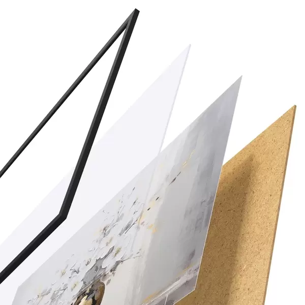 Le poster se compose d'un cadre, d'un plexiglas, d'une image imprimée et d'un support en aggloméré. Le poster peut être immédiatement accroché au mur grâce aux fixations au dos.