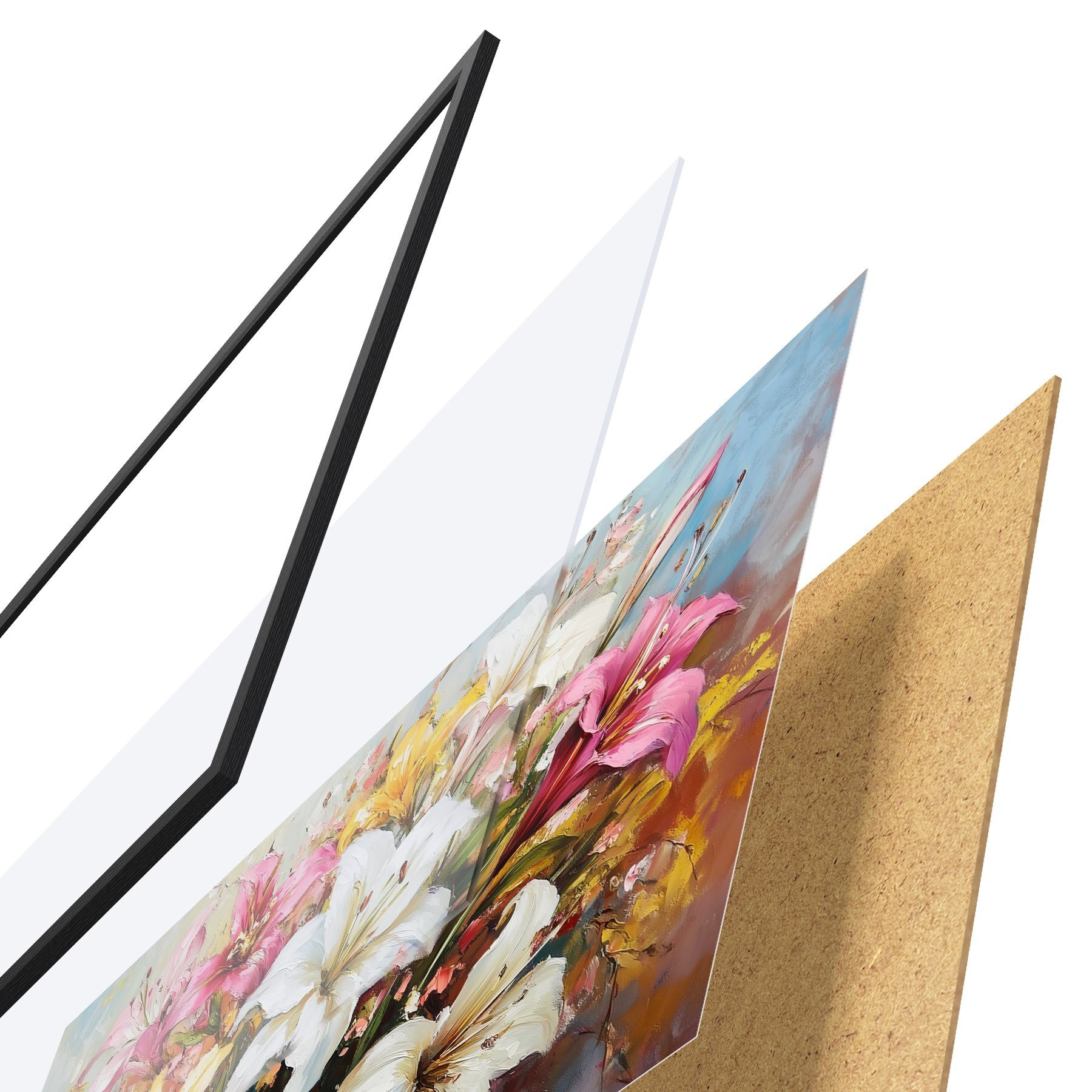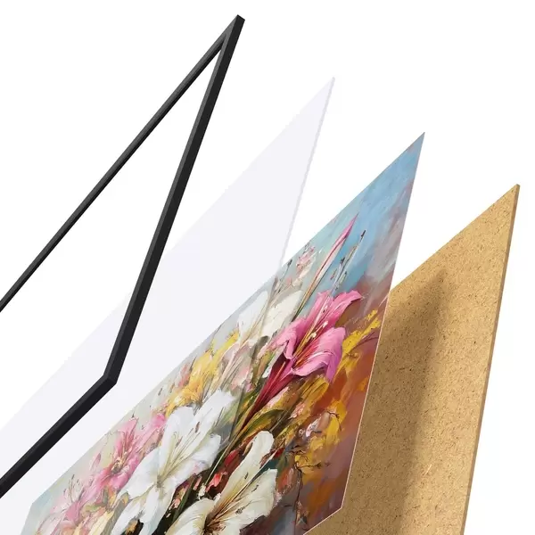 Le poster se compose d'un cadre, d'un plexiglas, d'une image imprimée et d'un support en aggloméré. Le poster peut être immédiatement accroché au mur grâce aux fixations au dos.