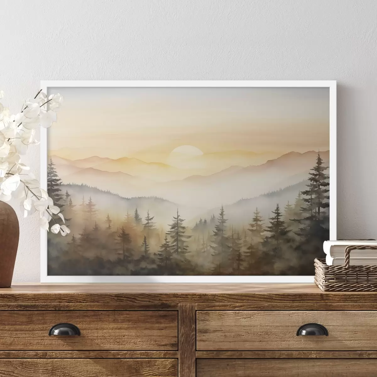 Affiche Aquarelle, paysage de montagnes d'automne, forêt de pins, coucher de soleil Non f41645