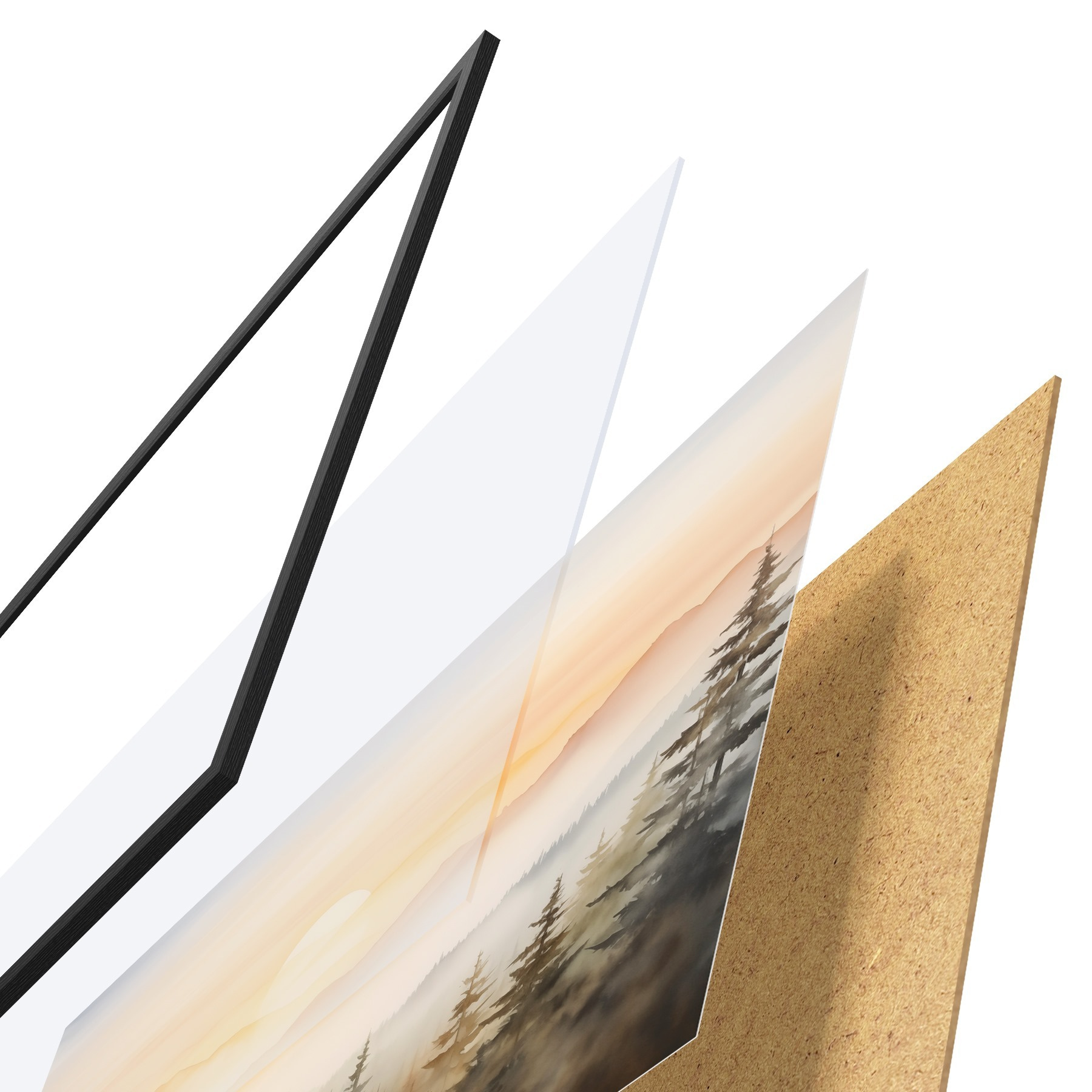 Le poster se compose d'un cadre, d'un plexiglas, d'une image imprimée et d'un support en aggloméré. Le poster peut être immédiatement accroché au mur grâce aux fixations au dos.