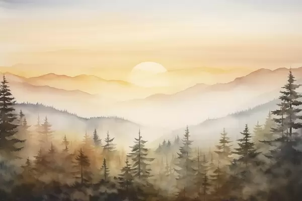 Affiche Aquarelle, paysage de montagnes d'automne, forêt de pins, coucher de soleil Non f41645