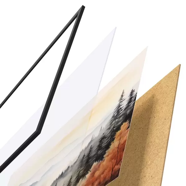 Le poster se compose d'un cadre, d'un plexiglas, d'une image imprimée et d'un support en aggloméré. Le poster peut être immédiatement accroché au mur grâce aux fixations au dos.