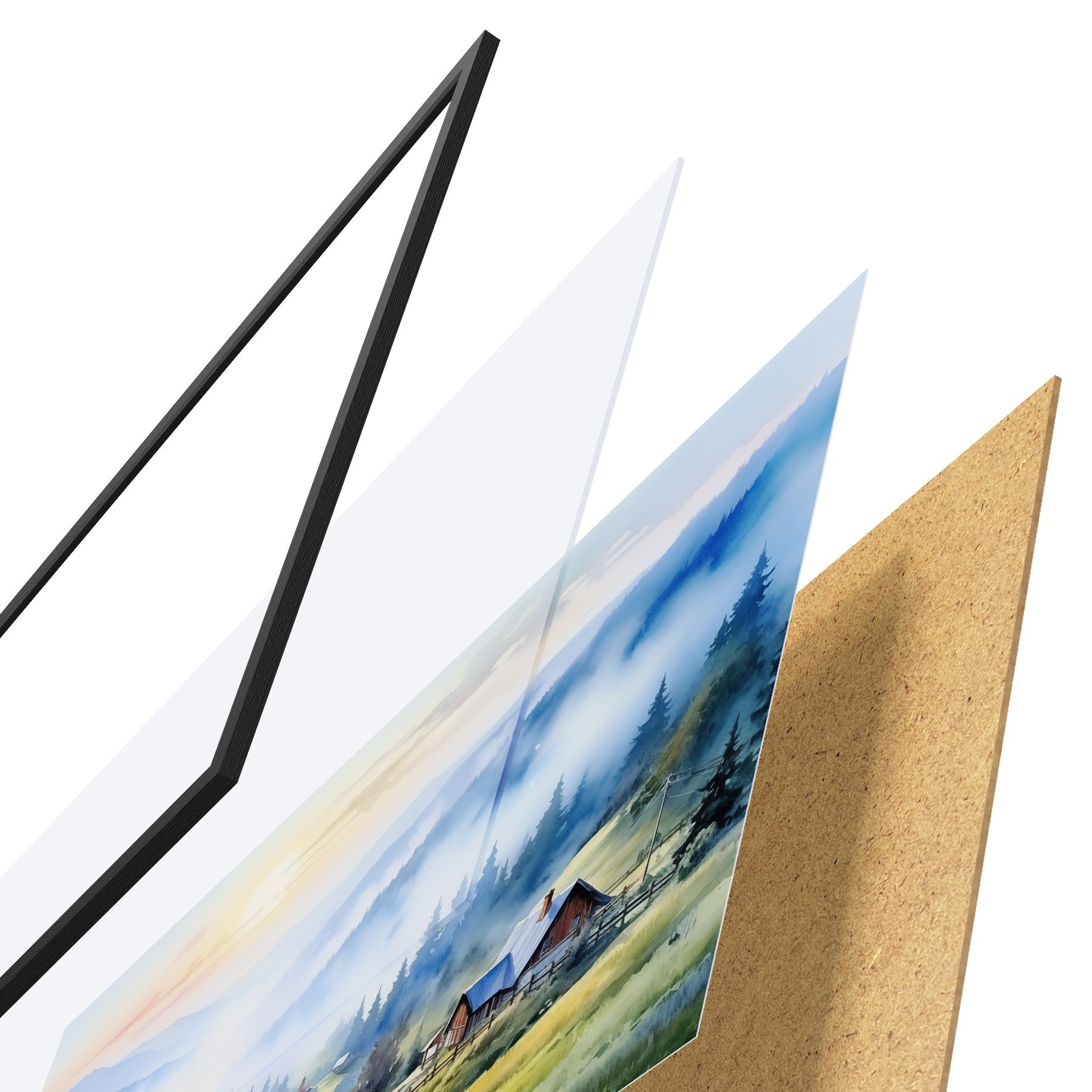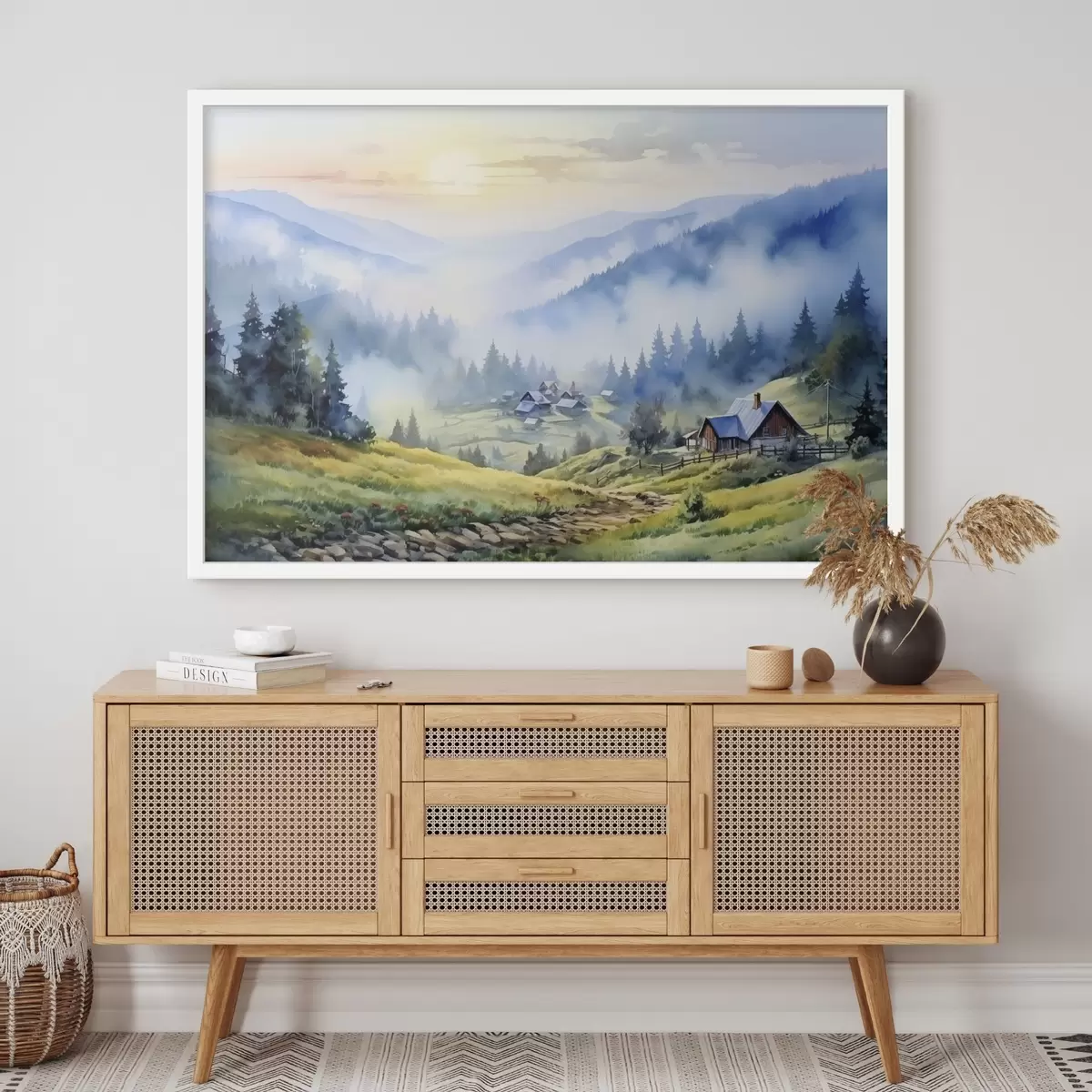 Affiche Village des Carpates dans les montagnes brumeuses, forêt, aquarelle f41648
