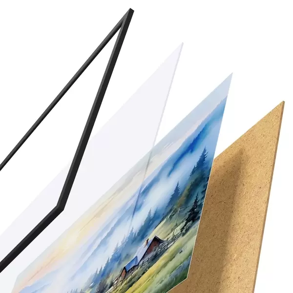 Le poster se compose d'un cadre, d'un plexiglas, d'une image imprimée et d'un support en aggloméré. Le poster peut être immédiatement accroché au mur grâce aux fixations au dos.