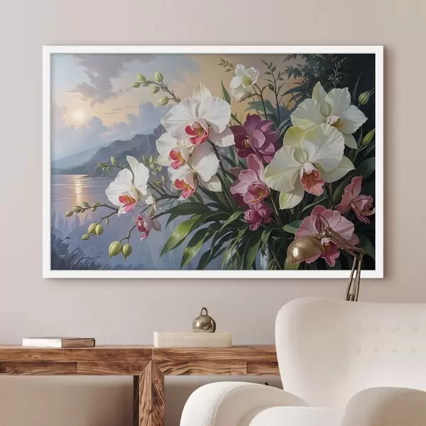 Affiche Un bouquet vibrant de fleurs tropicales avec des orchidées et un feuillage vert luxuriant sur fond de paysage marin f41713