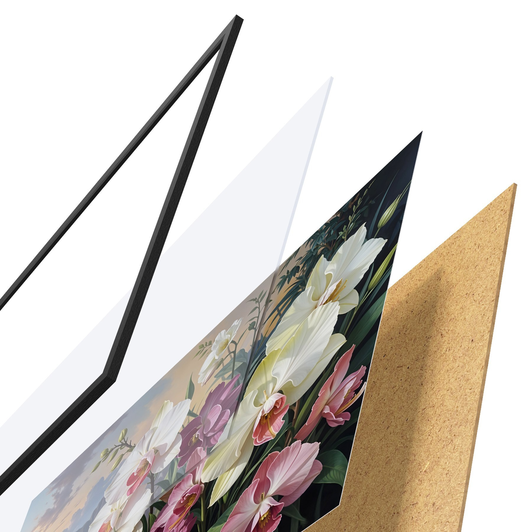 Affiche Un bouquet vibrant de fleurs tropicales avec des orchidées et un feuillage vert luxuriant sur fond de paysage marin Non f41713