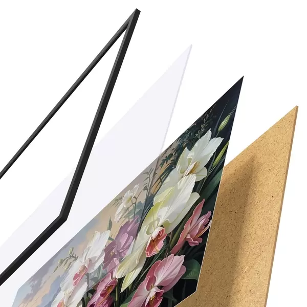 Le poster se compose d'un cadre, d'un plexiglas, d'une image imprimée et d'un support en aggloméré. Le poster peut être immédiatement accroché au mur grâce aux fixations au dos.