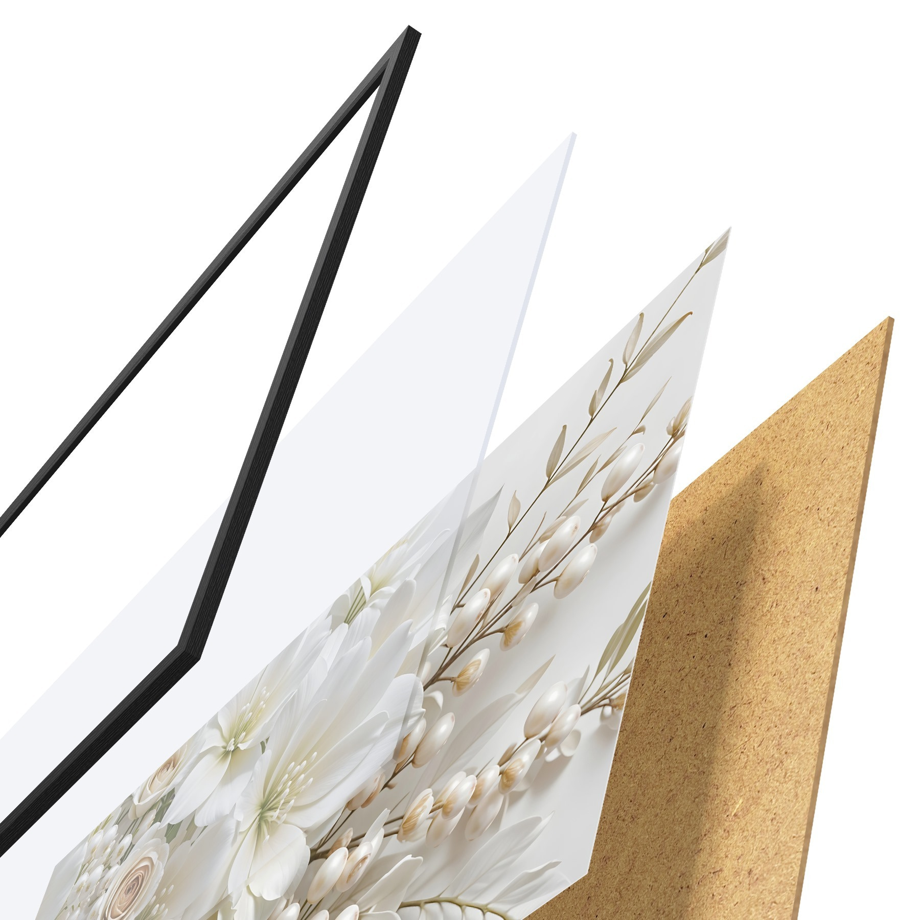 Le poster se compose d'un cadre, d'un plexiglas, d'une image imprimée et d'un support en aggloméré. Le poster peut être immédiatement accroché au mur grâce aux fixations au dos.