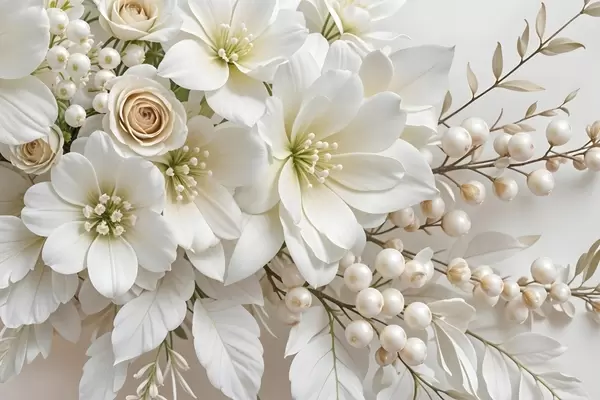 Affiche Fleurs blanches délicates, y compris lys, roses et autres fleurs aux pétales doux et veloutés f41722