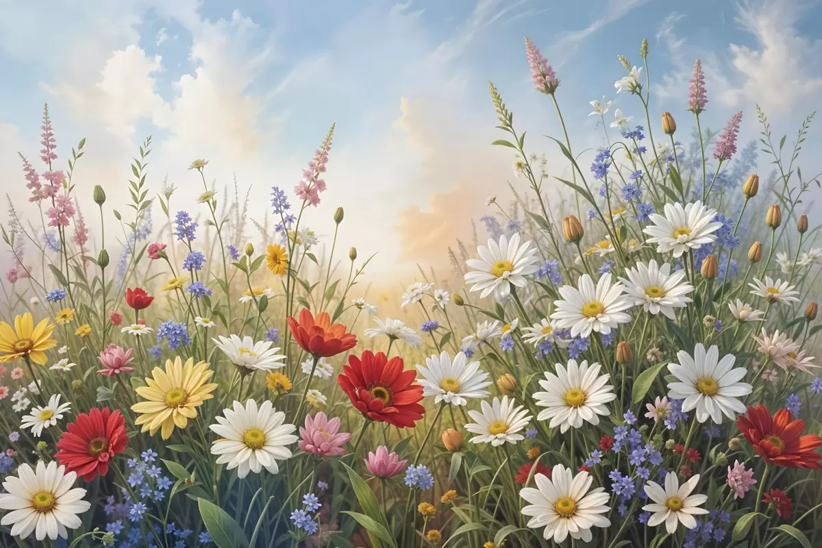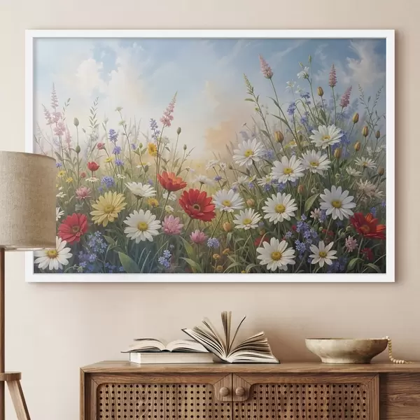Affiche Un champ de fleurs sauvages colorées comprenant des marguerites, des coquelicots et d'autres plantes en fleurs sur fond de ciel bleu Non f41725