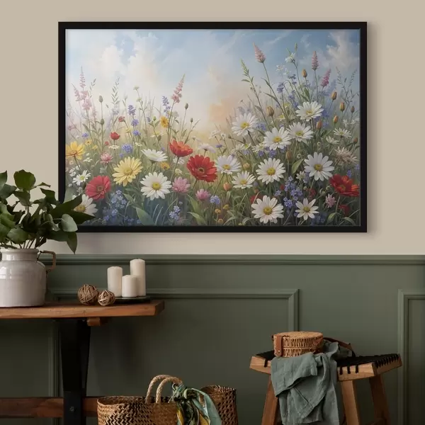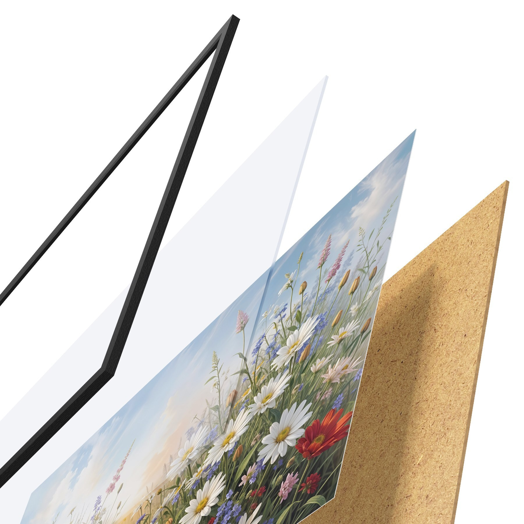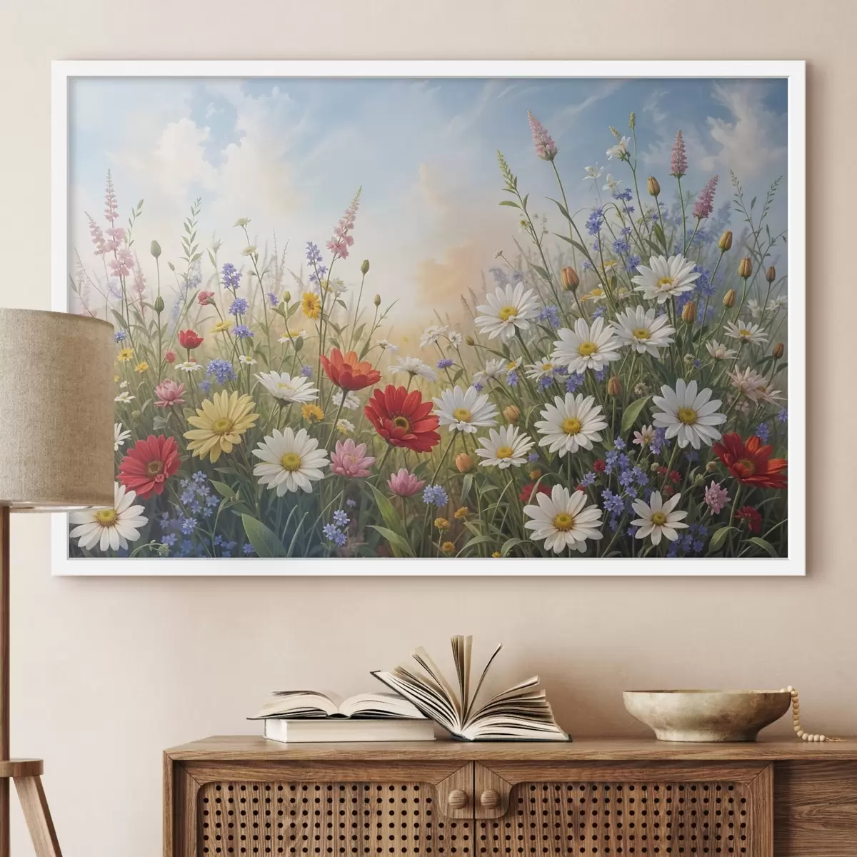 Affiche Un champ de fleurs sauvages colorées comprenant des marguerites, des coquelicots et d'autres plantes en fleurs sur fond de ciel bleu f41725