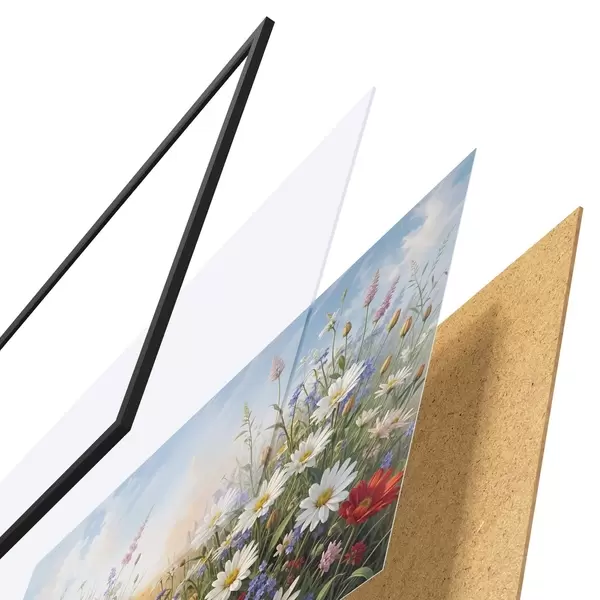 Le poster se compose d'un cadre, d'un plexiglas, d'une image imprimée et d'un support en aggloméré. Le poster peut être immédiatement accroché au mur grâce aux fixations au dos.