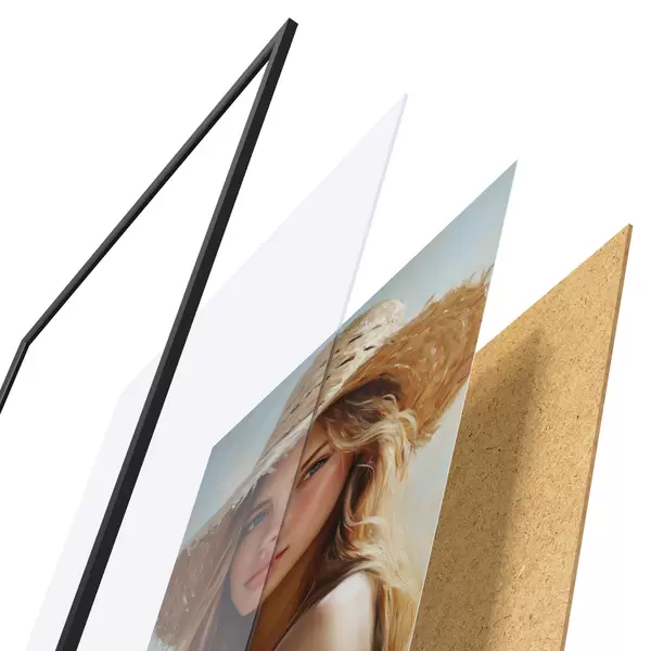 Le poster se compose d'un cadre, d'un plexiglas, d'une image imprimée et d'un support en aggloméré. Le poster peut être immédiatement accroché au mur grâce aux fixations au dos.