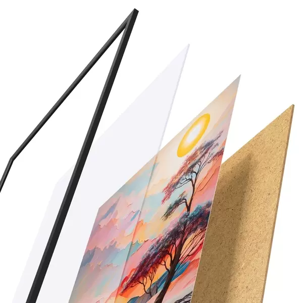 Le poster se compose d'un cadre, d'un plexiglas, d'une image imprimée et d'un support en aggloméré. Le poster peut être immédiatement accroché au mur grâce aux fixations au dos.