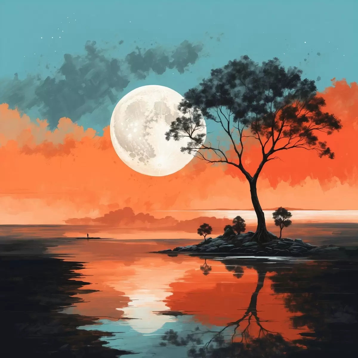 Affiche Arbre au milieu d'un lac sur fond de lune Non f41775