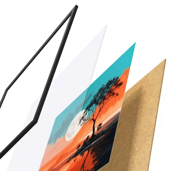 Le poster se compose d'un cadre, d'un plexiglas, d'une image imprimée et d'un support en aggloméré. Le poster peut être immédiatement accroché au mur grâce aux fixations au dos.