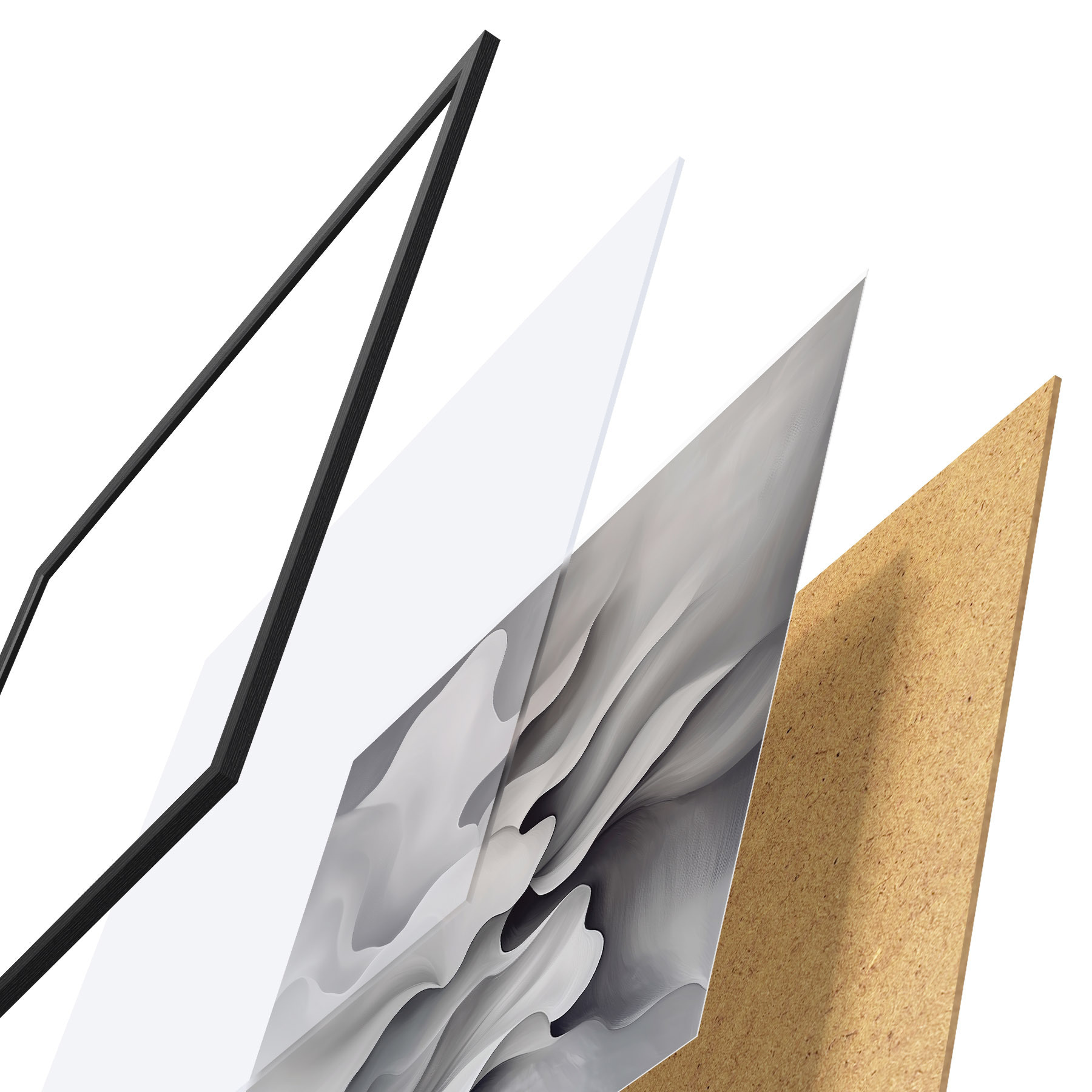 Le poster se compose d'un cadre, d'un plexiglas, d'une image imprimée et d'un support en aggloméré. Le poster peut être immédiatement accroché au mur grâce aux fixations au dos.