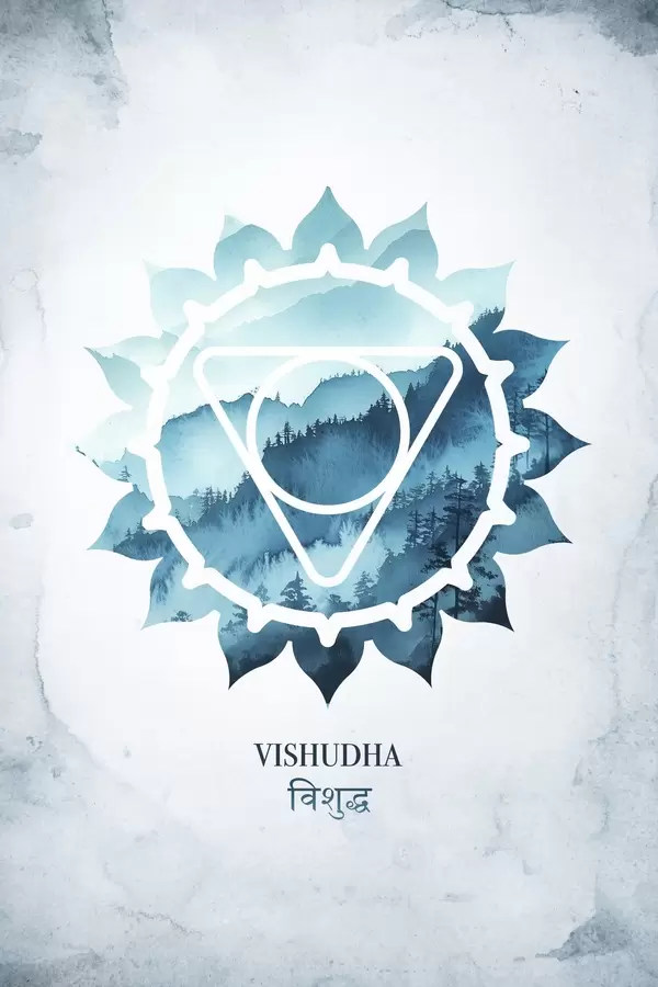 Affiche Vishuddha chakra, chakra bleu, ésotérique, méditation, bouddhisme, montagnes style aquarelle f41884
