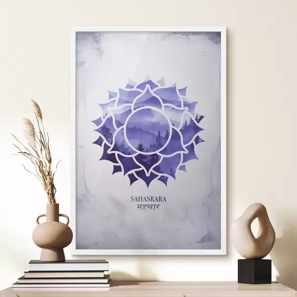Affiche Sahasrara chakra, chakra violet, ésotérique, méditation, bouddhisme, montagnes à l'aquarelle Non f41886