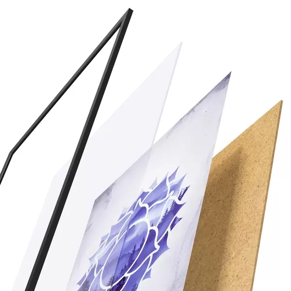 Le poster se compose d'un cadre, d'un plexiglas, d'une image imprimée et d'un support en aggloméré. Le poster peut être immédiatement accroché au mur grâce aux fixations au dos.