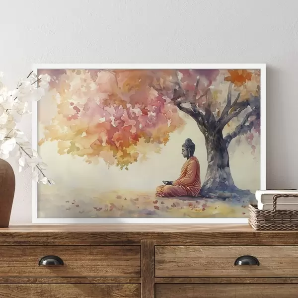 Affiche Bouddha méditant sous l'arbre, style aquarelle, automne, ésotérique f41887