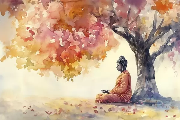 Affiche Bouddha méditant sous l'arbre, style aquarelle, automne, ésotérique f41887
