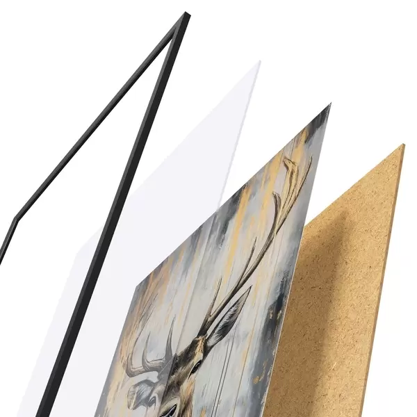 Le poster se compose d'un cadre, d'un plexiglas, d'une image imprimée et d'un support en aggloméré. Le poster peut être immédiatement accroché au mur grâce aux fixations au dos.