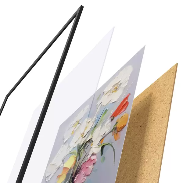 Le poster se compose d'un cadre, d'un plexiglas, d'une image imprimée et d'un support en aggloméré. Le poster peut être immédiatement accroché au mur grâce aux fixations au dos.