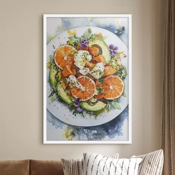 Affiche Délicieuse salade d'oranges, de feta, de citrouilles et d'avocats, aquarelle alimentaire Non f41959