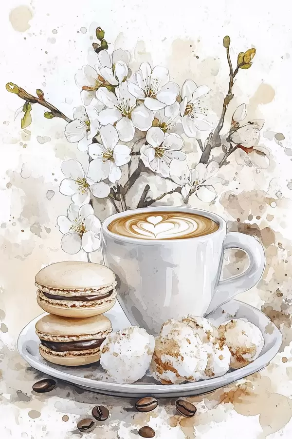Affiche Belle tasse de café, fleurs de jasmin, macarons, couleurs douces de l'aquarelle Non f41964