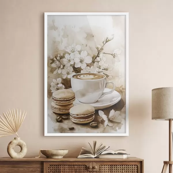 Affiche Macarons, tasse de café, style aquarelle, couleurs beiges, fleurs de jasmin f41965