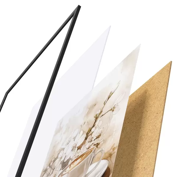 Le poster se compose d'un cadre, d'un plexiglas, d'une image imprimée et d'un support en aggloméré. Le poster peut être immédiatement accroché au mur grâce aux fixations au dos.