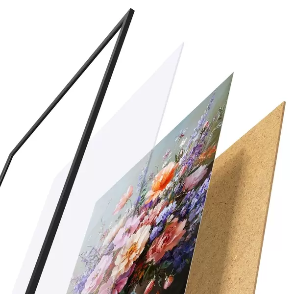 Le poster se compose d'un cadre, d'un plexiglas, d'une image imprimée et d'un support en aggloméré. Le poster peut être immédiatement accroché au mur grâce aux fixations au dos.