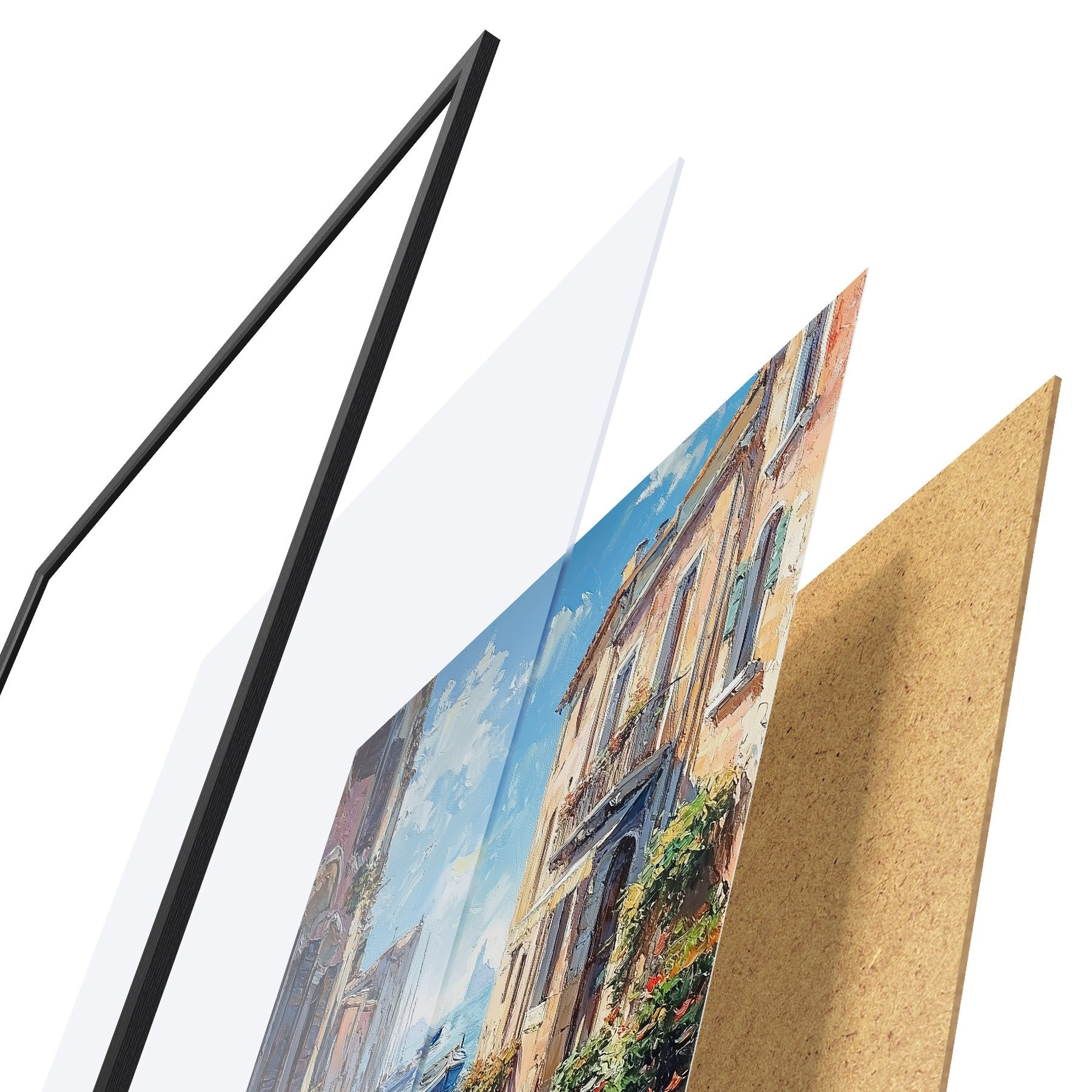 Le poster se compose d'un cadre, d'un plexiglas, d'une image imprimée et d'un support en aggloméré. Le poster peut être immédiatement accroché au mur grâce aux fixations au dos.