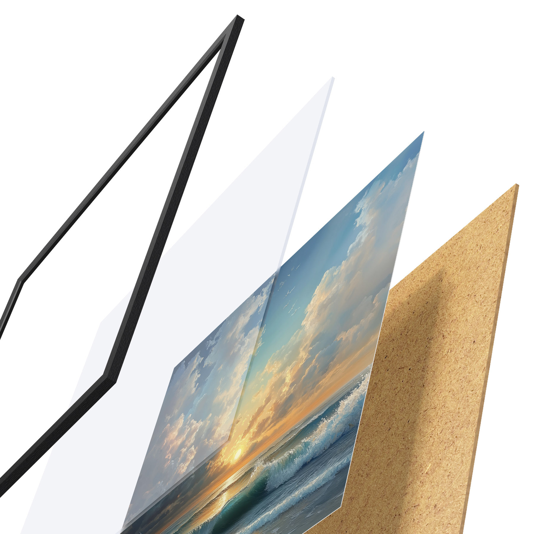 Le poster se compose d'un cadre, d'un plexiglas, d'une image imprimée et d'un support en aggloméré. Le poster peut être immédiatement accroché au mur grâce aux fixations au dos.