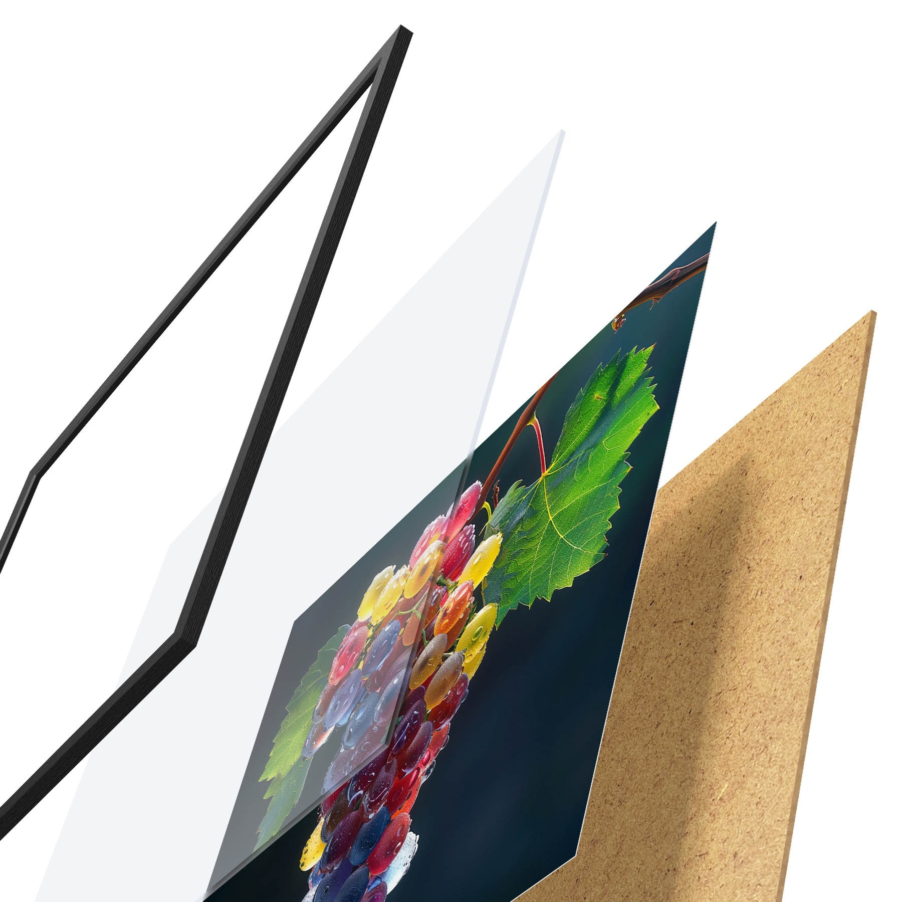 Le poster se compose d'un cadre, d'un plexiglas, d'une image imprimée et d'un support en aggloméré. Le poster peut être immédiatement accroché au mur grâce aux fixations au dos.