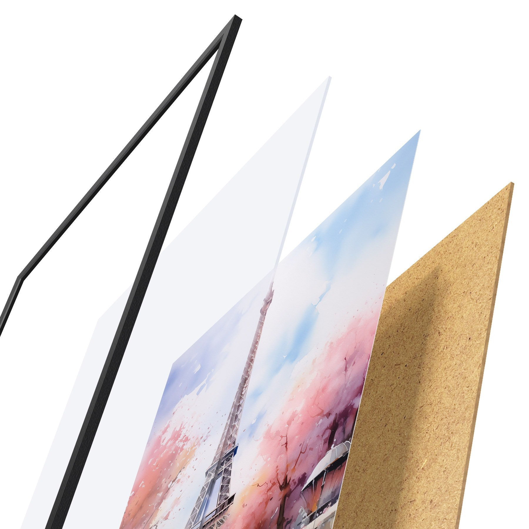 Le poster se compose d'un cadre, d'un plexiglas, d'une image imprimée et d'un support en aggloméré. Le poster peut être immédiatement accroché au mur grâce aux fixations au dos.