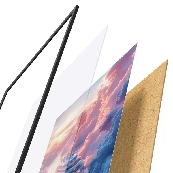 Le poster se compose d'un cadre, d'un plexiglas, d'une image imprimée et d'un support en aggloméré. Le poster peut être immédiatement accroché au mur grâce aux fixations au dos.