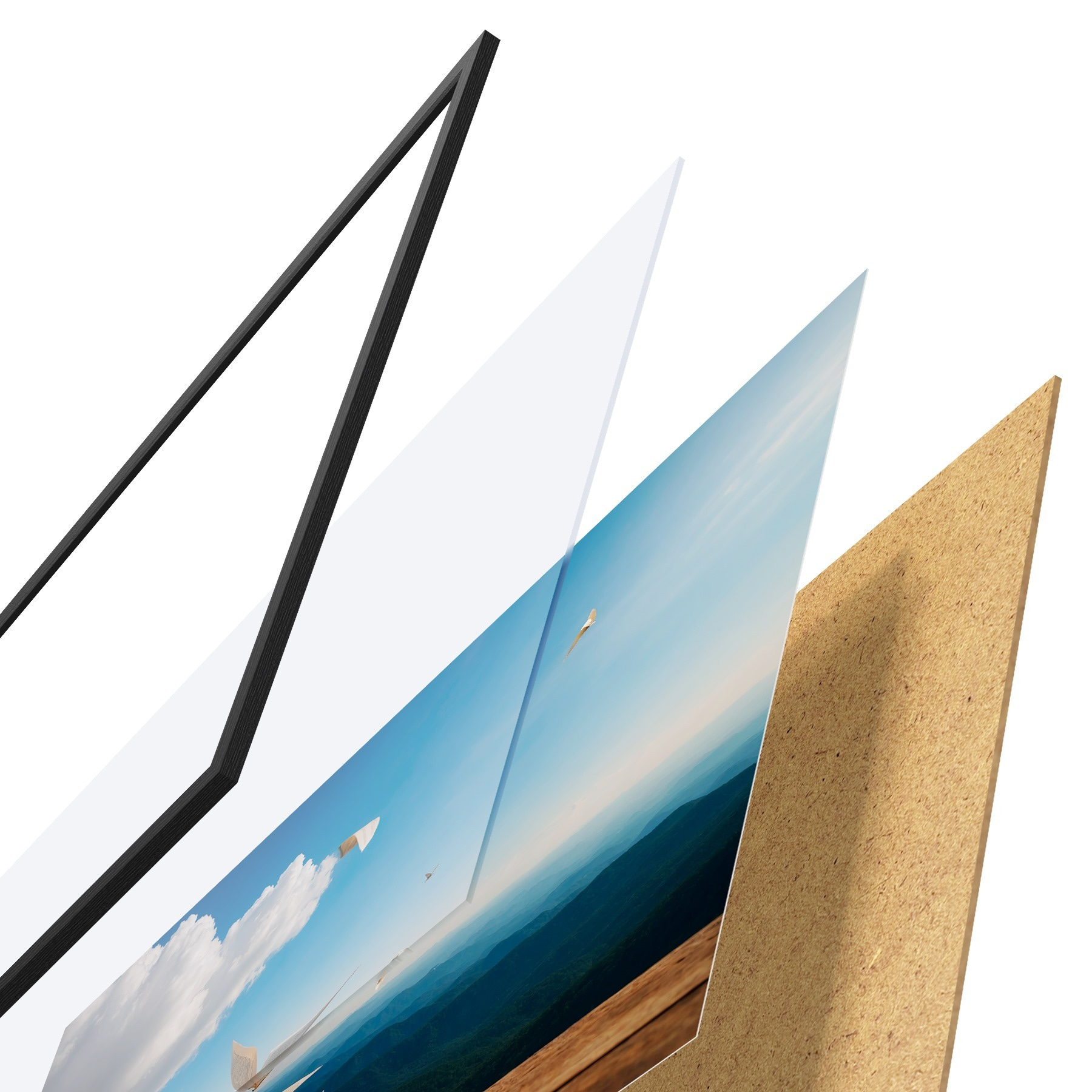 Le poster se compose d'un cadre, d'un plexiglas, d'une image imprimée et d'un support en aggloméré. Le poster peut être immédiatement accroché au mur grâce aux fixations au dos.